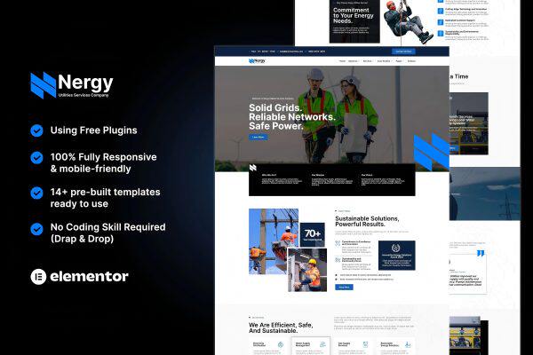 Nergy 是一款现代化的 Elementor 模板套件,非常适合为公用事业服务、公用事业公司、公用事业业务、公用事业顾问以及任何与公用事业或商业服务相关的机构创建网站。使用这款 Elementor 套件,您可以节省时间,打造专业网站。只需拖放即可,无需编码。